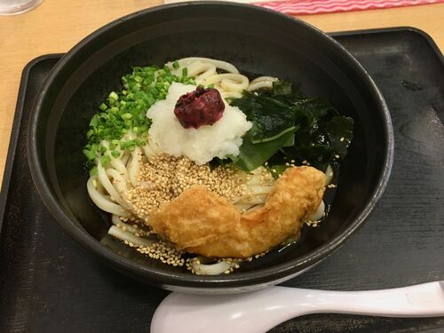 よくランチで行くお店の梅おろし冷やしうどん。 暑くなってくるとたまに食べたくなります。 今日はサービスで、カボチャの天ぷら無料トッピング。ラッキーでした。